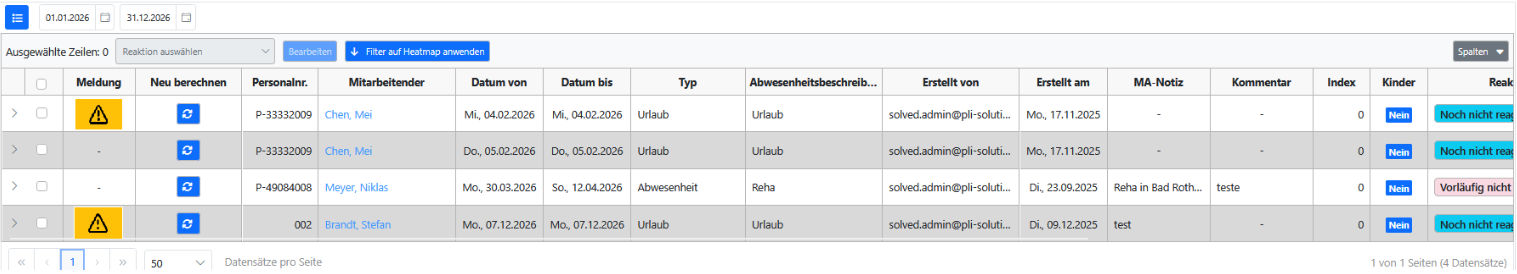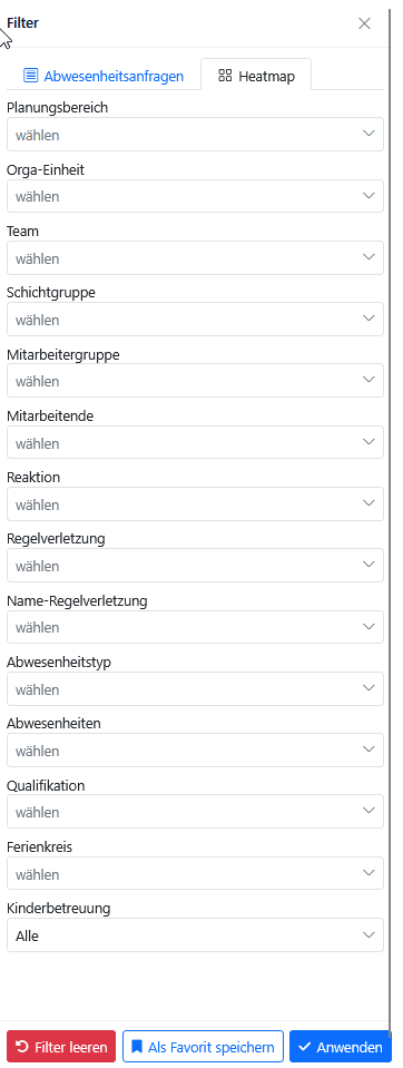 Die Filter werden bereichsbezogen angezeigt (z. B. Abwesenheitsanfragen oder Heatmap).