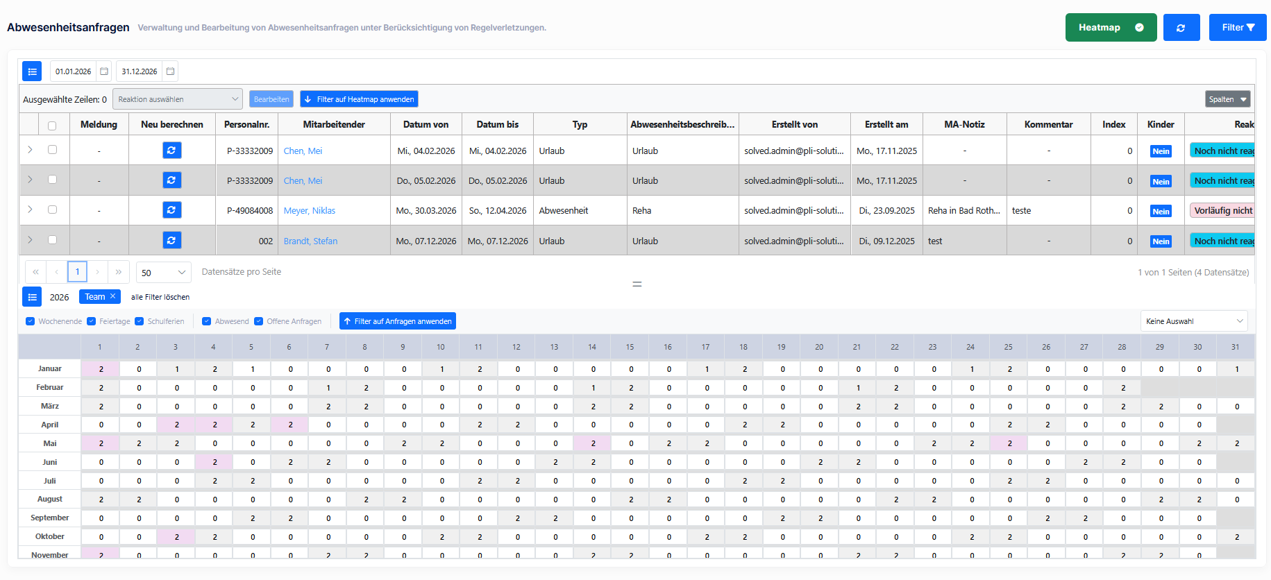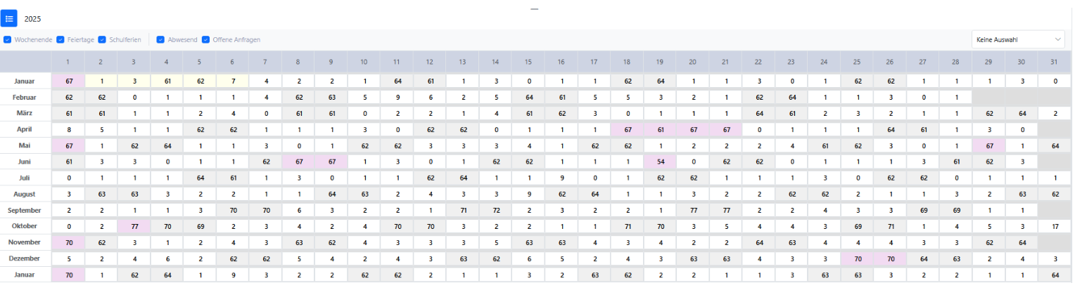 Die Heatmap zeigt damit nicht nur beantragte Abwesenheiten, sondern auch planungsbedingte Abwesenheiten, die aus der Schichtstruktur entstehen.